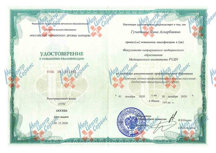 | 2020 г. | Повышение квалификации по программе ДПО «Первичная медико-профилактическая помощь населению (медсестры процедурных кабинетов». РУДН |