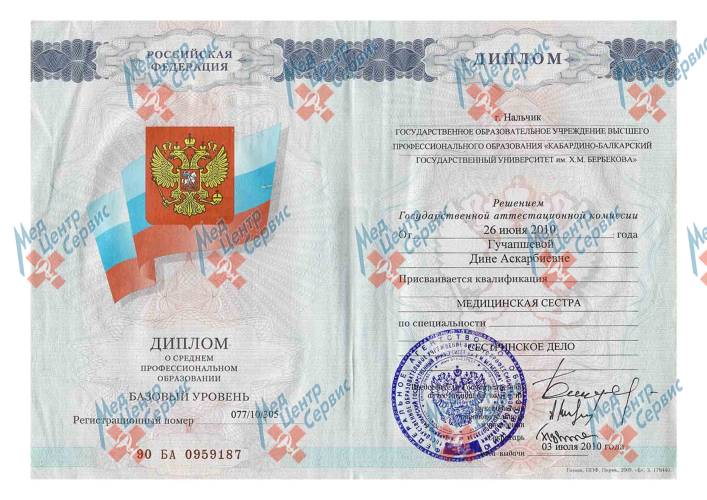 | 2010 г. | Диплом о среднем профессиональном образовании по специальности «Сестринское дело». ГОУ ВПО «Кабардино-Балкарский государственный университет им. Х.М. Бербекова» |