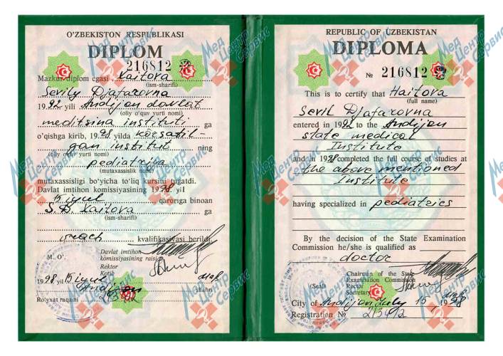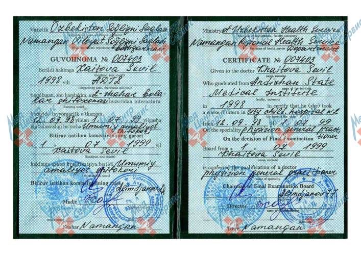 | 1998 г. | Диплом по специальности "Педиатрия". Андижанский государственный медицинский институт |