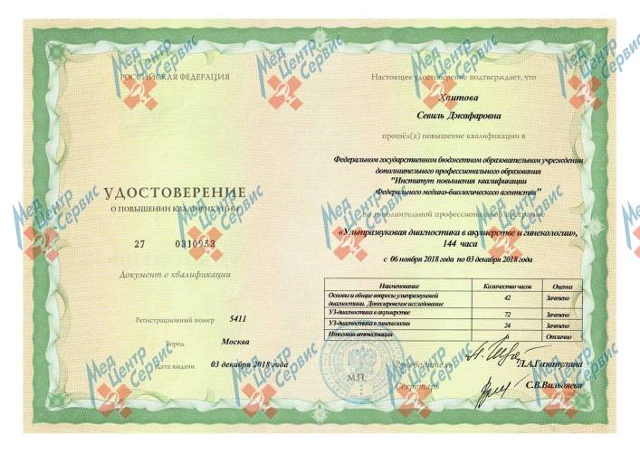 | 2018 г. | Повышение квалификации по дополнительной профессиональной программе "Ультразвуковая диагностика в акушерстве и гинекологии". ФГБОУ ДПО "Институт повышения квалификации Федерального медико-биологического агентства" |