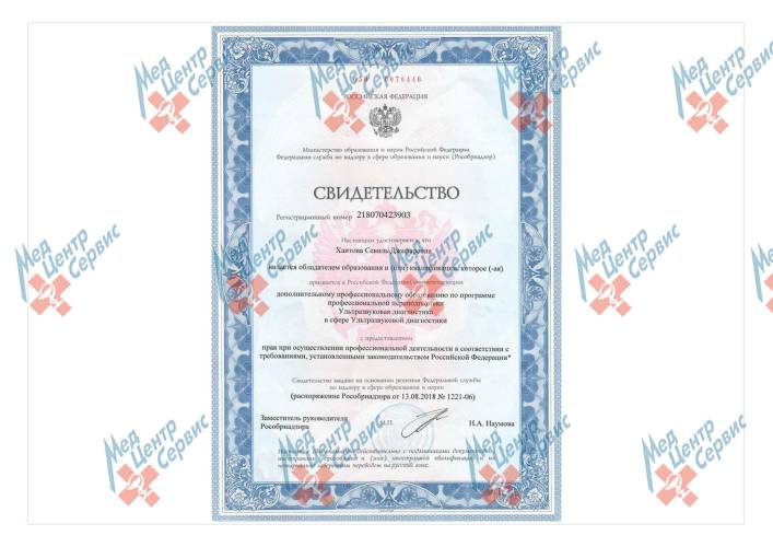 | 2018 г. | Повышение квалификации по направлению "Ультразвуковая диагностика". ФГБОУ ВО Первый МГМУ им. И. М. Сеченова МЗ РФ |