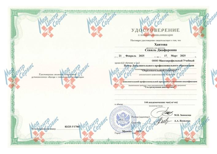 | 2025 г. | Повышение квалификации по дополнительной профессиональной программе «Ультразвуковая диагностика». ООО МУЦ ДПО «Образовательный стандарт» |