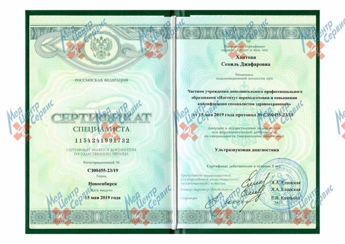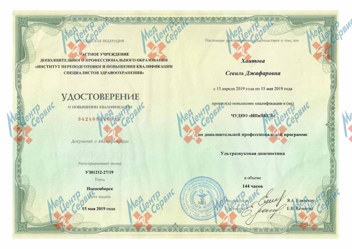 | 2019 г. | Повышение квалификации по специальности "Ультразвуковая диагностика". ЧУ ДПО "ИПиПКСЗ" |
