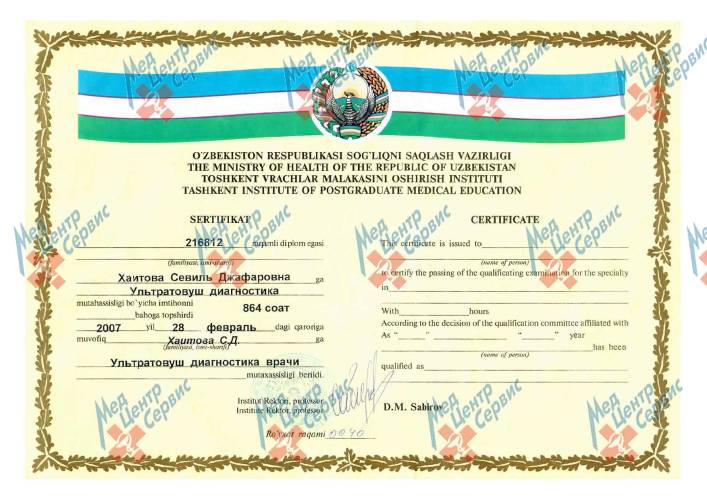 | 2007 г. | Профессиональная переподготовка по направлению «Ультразвуковая диагностика». Ташкентский институт последипломного медицинского образования |