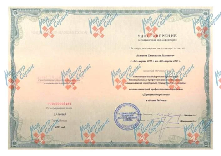 | 2025 г. | Повышение квалификации по дополнительной профессиональной программе «Дерматовенерология». АНО ДПО «Национальный университет государственной службы» |