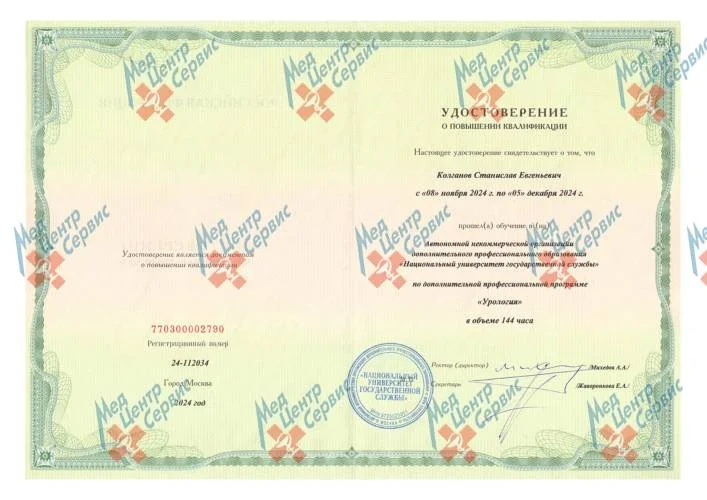 | 2024 г. | Повышение квалификации по дополнительной профессиональной программе «Урология». АНО ДПО «Национальный университет государственной службы» |