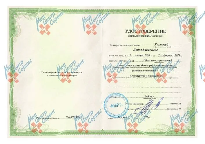 | 2024 г. | Повышение квалификации по дополнительной профессиональной программе «Акушерство и гинекология». ООО МАРТ |