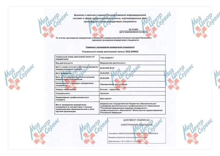 | 2025 г. | Периодическая аккредитация по специальности "Урология". ФГБОУ ДПО РМАНПО МЗ РФ Протокол № 82 от 26.08.2025 г. |