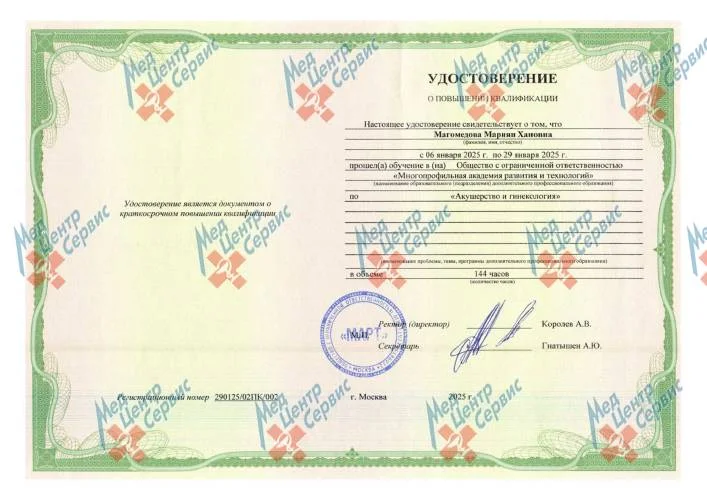 | 2025 г. | Повышение квалификации по дополнительной профессиональной программе «Акушерство и гинекология». ООО МАРТ |