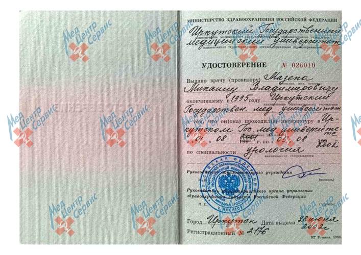 | 2002 г. | Интернатура по специальности «Урология» в Иркутском государственном медицинском университете |