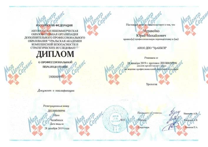 | 2019 г. | Профессиональная переподготовка по специальности «Урология». АНОО ДПО УрАКБСИ |