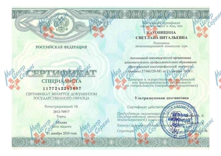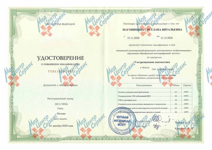 | 2020 г. | Повышение квалификации по направлению «Ультразвуковая диагностика». АНО ДПО «Центральный многопрофильный институт» |