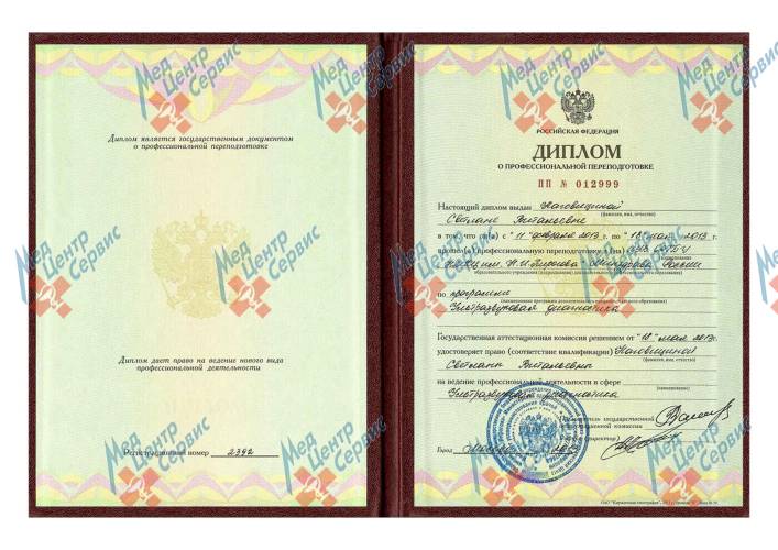 | 2013 г. | Профессиональная переподготовка по специальности «Ультразвуковая диагностика». ИУВ ФГБУ «НМХЦ им. Н.И. Пирогова» Минздрава России |