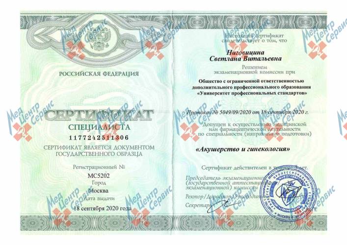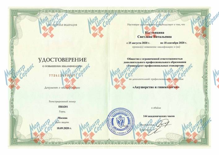 | 2020 г. | Повышение квалификации по специальности «Акушерство и гинекология». ООО ДПО «Университет профессиональных стандартов» |