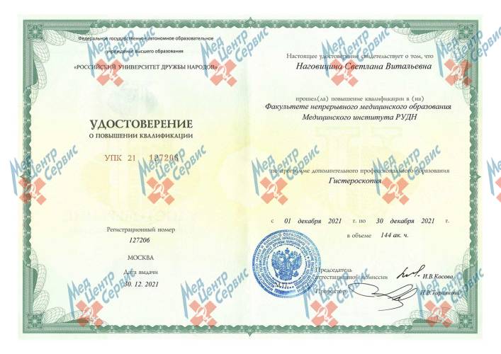 | 2021 г. | Повышение квалификации по программе дополнительного профессионального образования «Гистероскопия». ФГАОУ ВО РУДН |