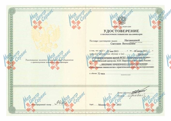 | 2013 г. | Краткосрочное повышение квалификации по программе тематического усовершенствования «Оперативная гинекология с практическим курсом гистероскопии». Институт усовершенствования врачей ФГБУ «Национальный медико-хирургический центр им. Н.И. Пирогова» МЗ РФ |