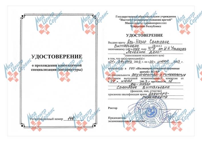 | 2003 г. | Интернатура по специальности «Акушерство и гинекология» в ГОУ «Институт усовершенствования врачей» МЗ ЧР |