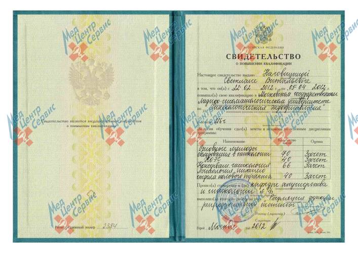 | 2012 г. | Повышение квалификации по программе «Гинекологическая эндокринология». МГМСУ |