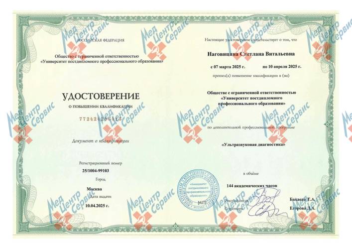 | 2025 г. | Повышение квалификации по дополнительной профессиональной программе «Ультразвуковая диагностика». ООО «Университет постдипломного профессионального образования» |