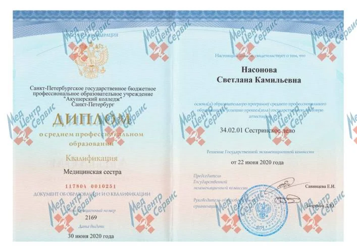 | 2020 г. | Диплом по специальности «Сестринское дело». Санкт-Петербургское ГБПОУ «Акушерский колледж» |