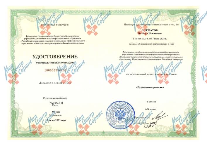 | 2025 г. | Повышение квалификации по дополнительной профессиональной программе «Дерматовенерология». ФГБОУ ДПО РМАНПО МЗ РФ |