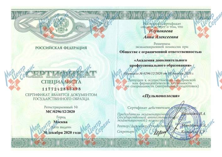 | 2020 г. | Повышение квалификации по специальности «Пульмонология». ООО «Академия дополнительного и профессионального образования» |