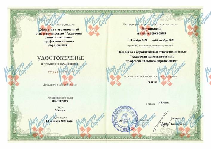 | 2020 г. | Повышение квалификации по специальности «Терапия» ООО «Академия дополнительного и профессионального образования» |