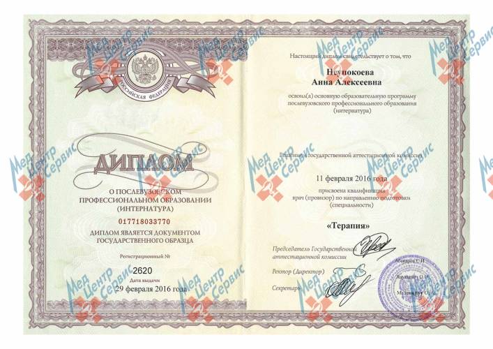 | 2016 г. | Интернатура по специальности «Терапия». ГБОУ ВПО Московский медицинский-стоматологический университет имени А.И. Евдокимова МЗ РФ |