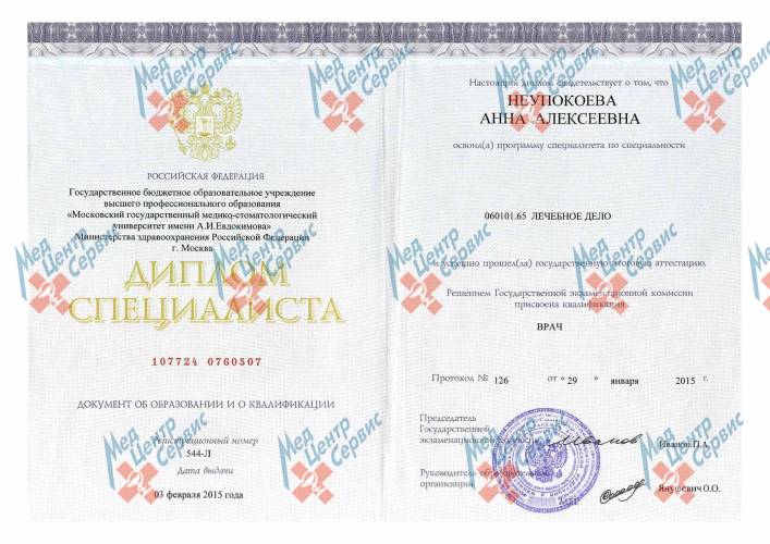 | 2015 г. | Диплом по специальности специальности «Лечебное дело». ГБОУ ВПО Московский медицинский-стоматологический университет имени А.И. Евдокимова МЗ РФ |