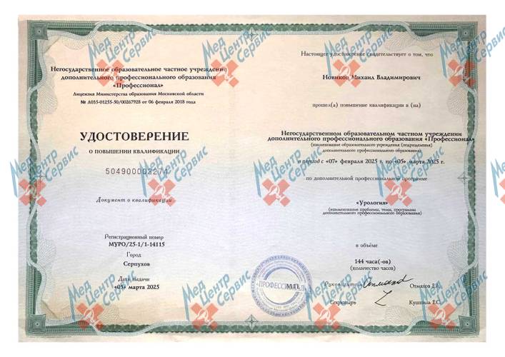 | 2025 г. | Повышение квалификации по дополнительной профессиональной программе «Урология». НОЧУ ДПО «Профессионал» |
