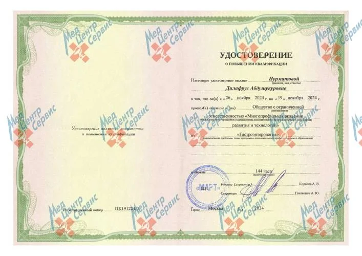 | 2024 г. | Повышение квалификации по специальности «Гастроэнтерология». ООО МАРТ |