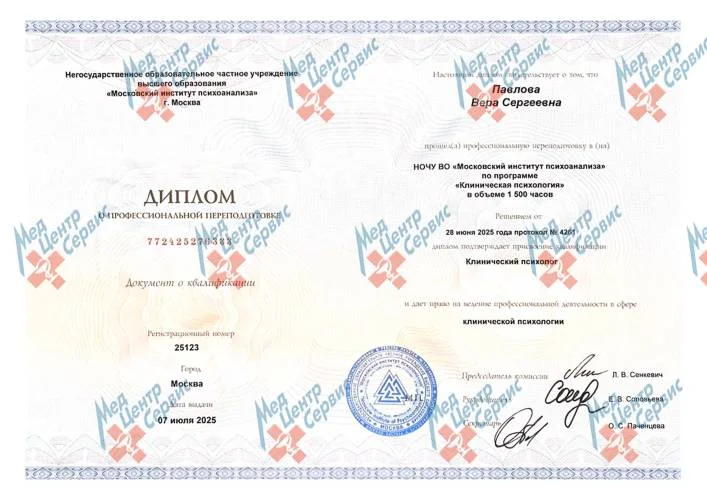 2025 г. | Профессиональная переподготовка по программе «Клиническая психология». НОЧУ ВО «Московский институт психоанализа» |
