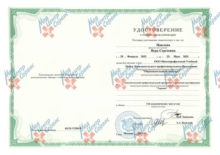 | 2025 г. | Повышение квалификации по дополнительной профессиональной программе «Терапия». ООО МУЦ ДПО «Образовательный стандарт» |