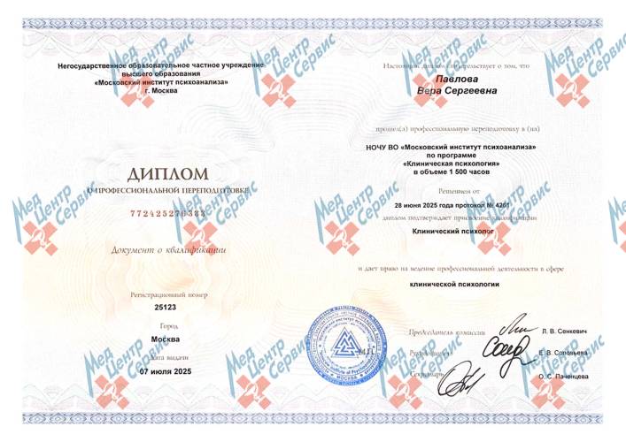 | 2025 г. | Профессиональная переподготовка по программе «Клиническая психология». НОЧУ ВО «Московский институт психоанализа» |