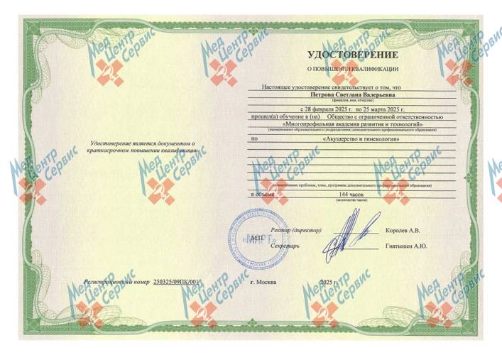 | 2025 г. | Повышение квалификации по дополнительной профессиональной программе «Акушерство и гинекология». ООО МАРТ |