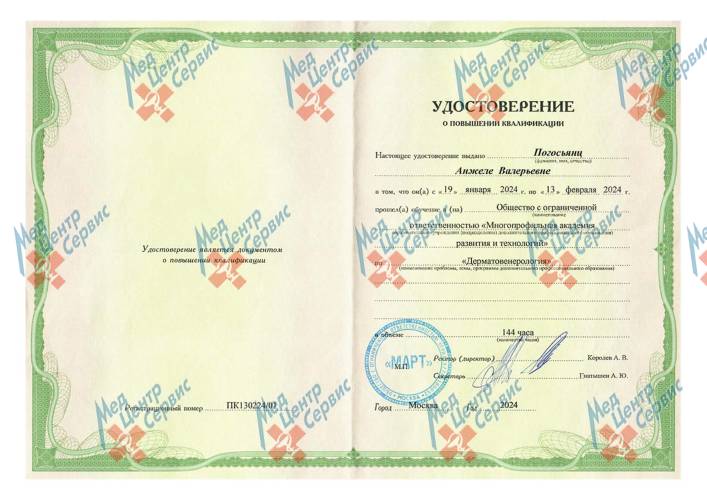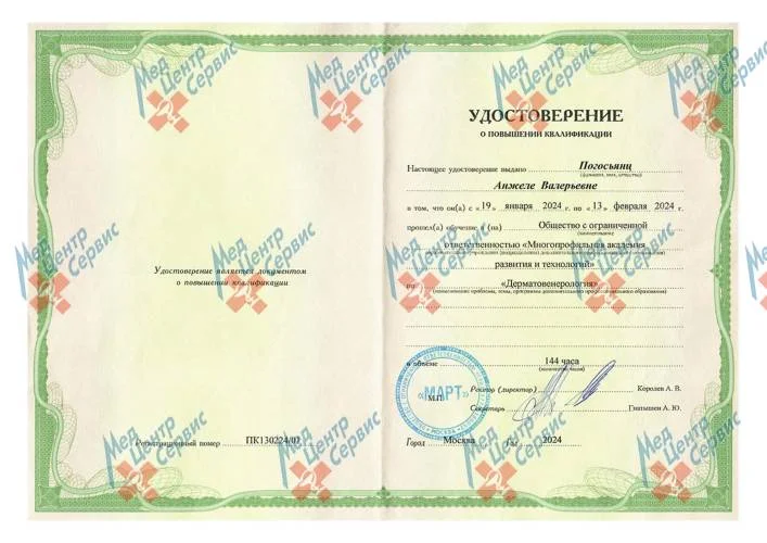 | 2024 г. | Повышение квалификации по специальности «Дерматовенерология». ООО МАРТ |