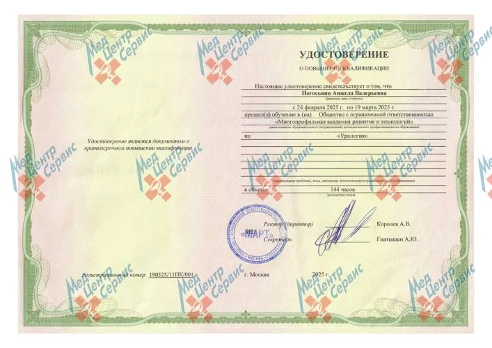 | 2025 г. | Повышение квалификации по специальности «Урология». ООО МАРТ |