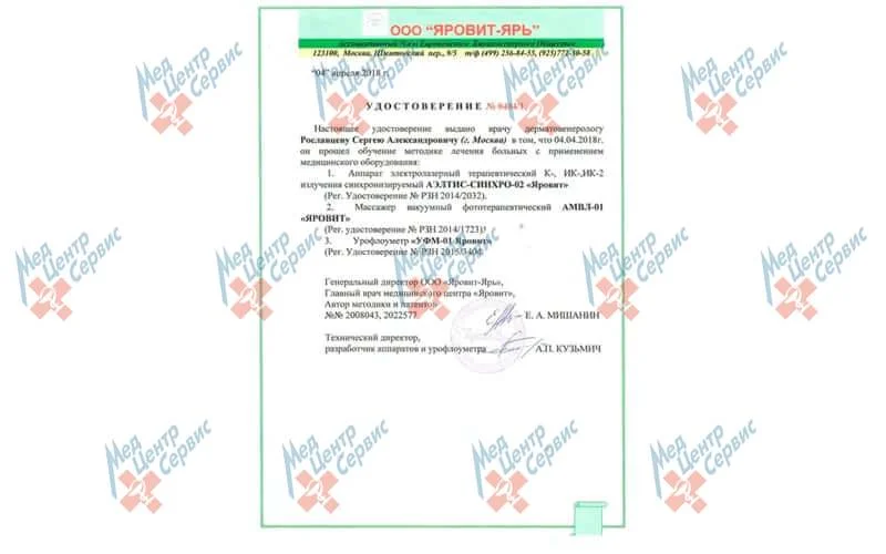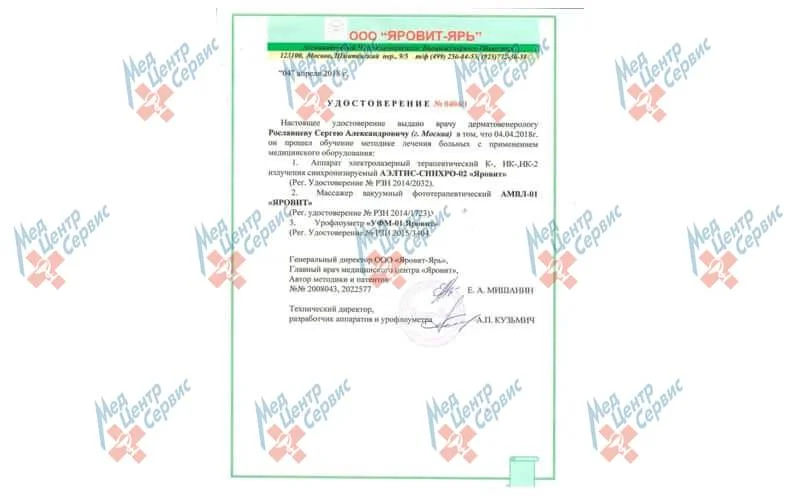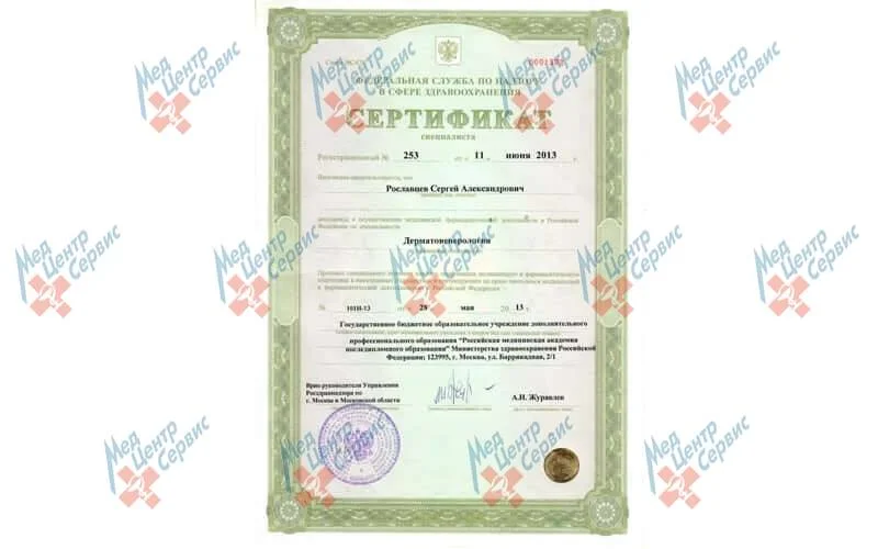| 2013 г. | Повышение квалификации по специальности «Дерматовенерология», Российская медицинская академия последипломного образования |