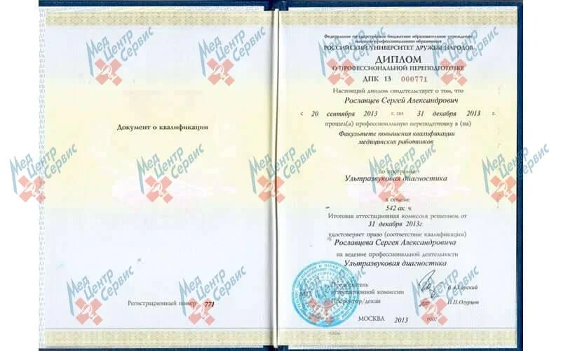 | 2013 г. | Профессиональная переподготовка по специальности «Ультразвуковая диагностика», РУДН |