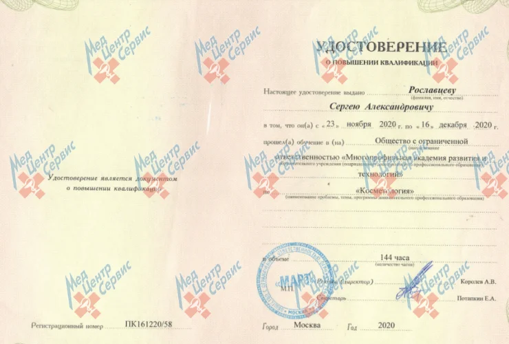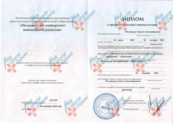 | 2020 г. | Повышение квалификации по специальности "Урология", АНО ДПО "Медицинский университет инноваций и развития" |