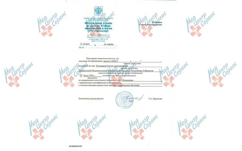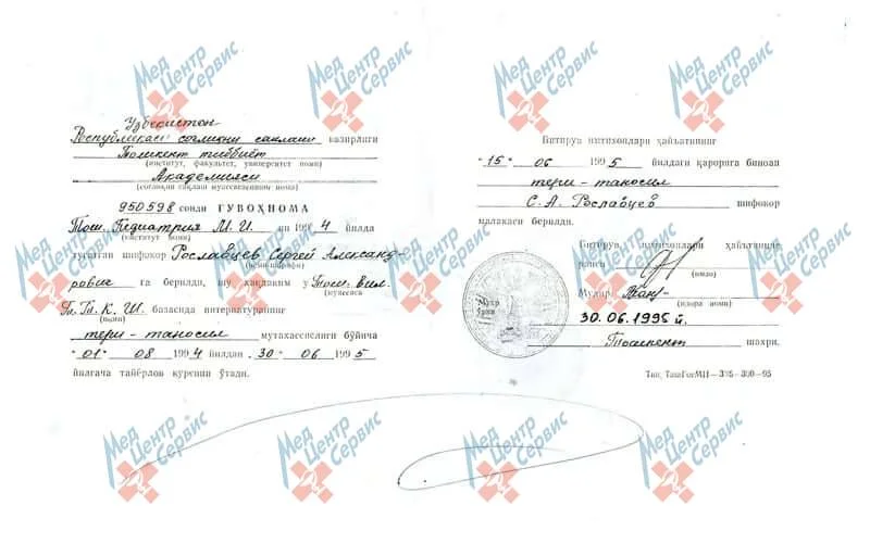 | 1995 г. | Интернатура по специальности «Дерматовенерология», Ташкентская медицинская академия |