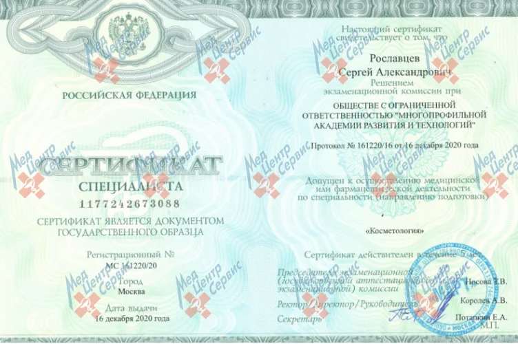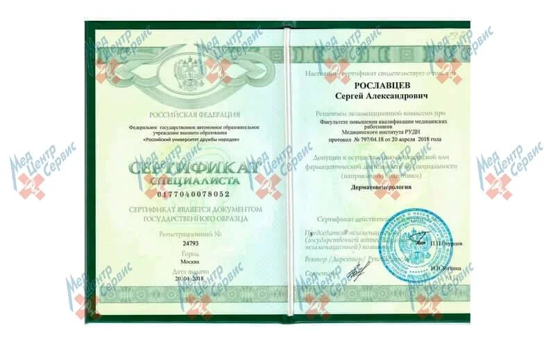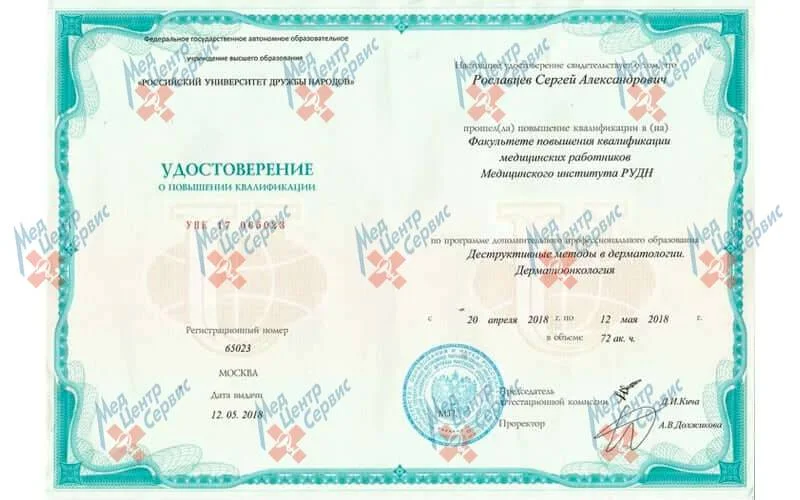 | 2018 г. | Повышение квалификации по специальности "Дерматовенерология", РУДН |
