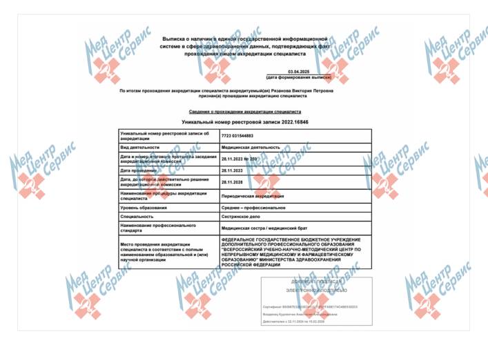 | 2023 г. | Периодическая аккредитация по специальности «Сестринское дело». ФГБУ ДПО «Всероссийский учебно-научно-методический центр по непрерывному медицинскому и фармацевтическому образованию» МЗ РФ |