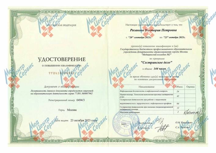 | 2023 г. | Повышение квалификации по специальности «Сестринское дело». ГБПОУ Департамента здравоохранения города Москвы «Медицинский колледж №2» |