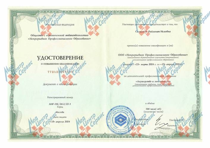 | 2024 г. | Повышение квалификации по дополнительной профессиональной программе "Акушерство и гинекология". ООО "Непрерывное Профессиональное Образование" |