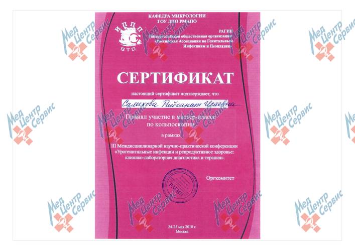 | 2010 г. | Участник мастер-класса по кольпоскопии в рамках III Междисциплинарной научно-практической конференции "Урогенитальные инфекции и репродуктивное здоровье: клинико-лабораторная диагностика и терапия". Кафедра микрологии ГОУ ДПО РМАПО. ООО РАГИН |