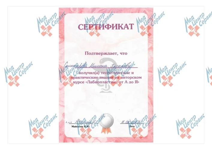 | 2023 г. | Получила теоретические и практические знания на авторском курсе «Лабиопластика от А до Я» |