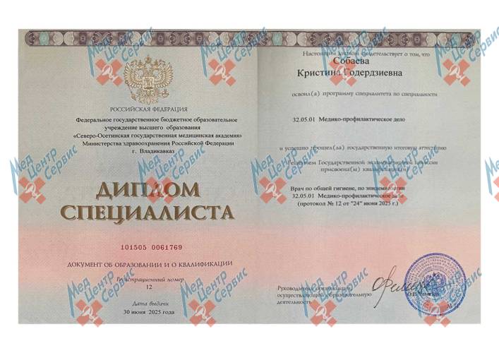 | 2025 г. | Диплом по специальности «Медико-профилактическое дело». ФГБОУ ВО «Северо-Осетинская государственная медицинская академия» МЗ РФ |