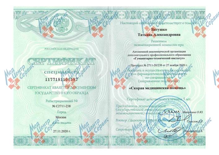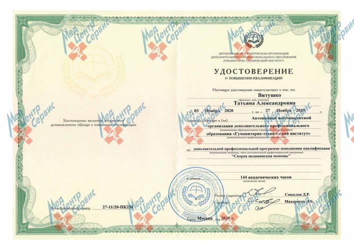 | 2020 г. | Повышение квалификации по направлению «Скорая медицинская помощь». АНО ДПО «Гуманитарно-технический институт» |