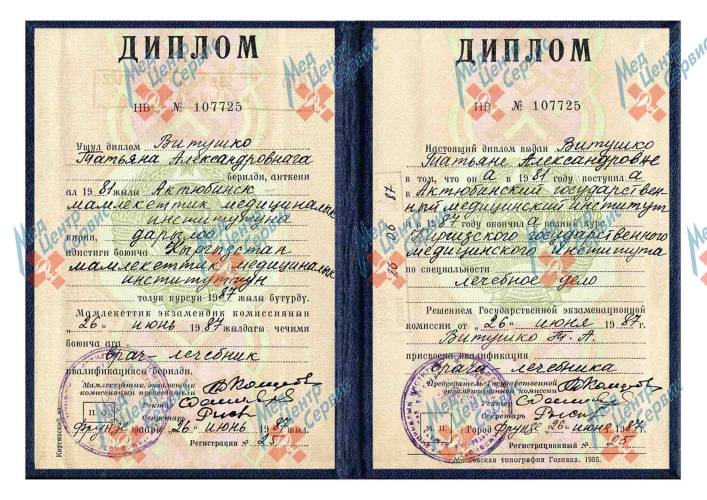 | 1987 г. | Диплом по специальности «Лечебное дело». Актюбинский ГМИ |